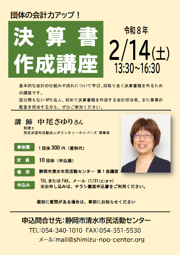 設立間もないNPO法人、初めて決算書類を作成する会計担当者、また事業の監査を担当する方も、ぜひご参加ください。